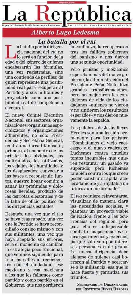 La batalla por el PRI 19Abr 201919 Jul 2020 Comparte esto:Tweet Compartir en WhatsApp (Se abre en una ventana nueva) WhatsApp Email a link to a friend (Se abre en una ventana nueva) Correo electrónico Me gusta Cargando... Relacionado