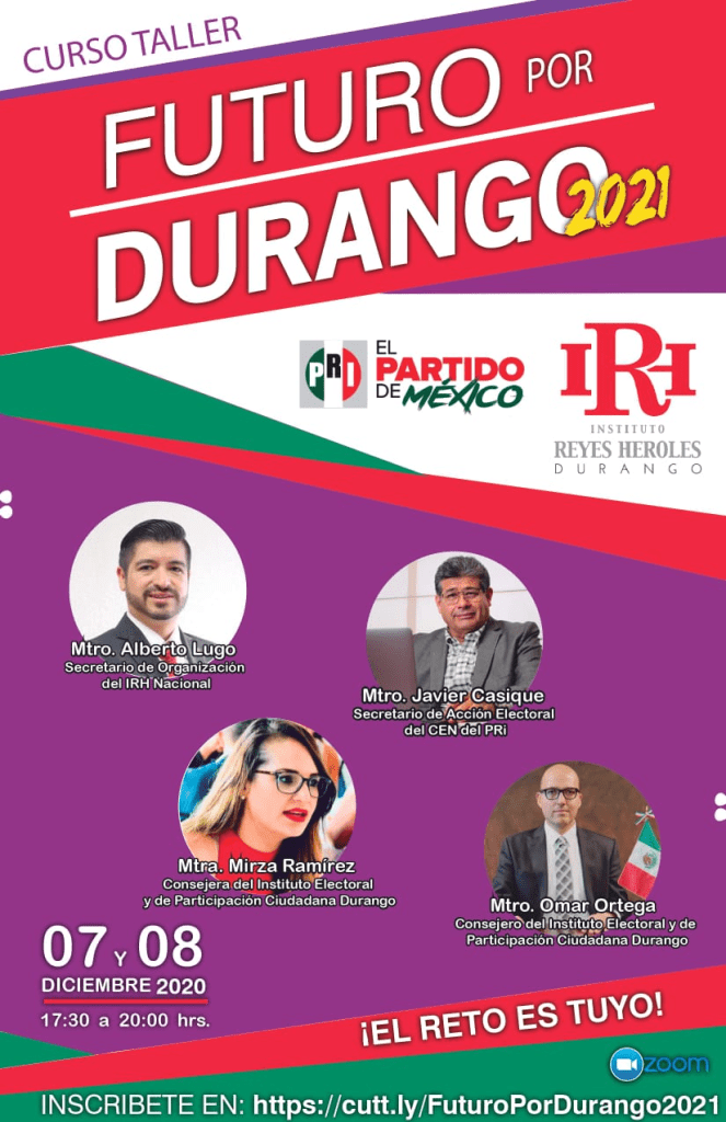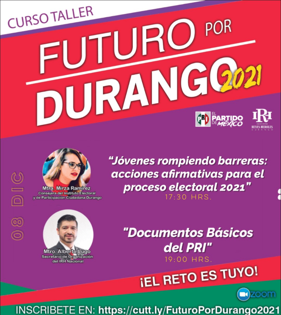Conferencia “Documentos Básicos del PRI”, en el Curso Taller «Futuro por Durango 2021», organizado por el Comité Directivo Estatal del Partido Revolucionario Institucional y el la filial del Instituto de Formación Política Jesús Reyes Heroles, A.C., en el estado de Durango.