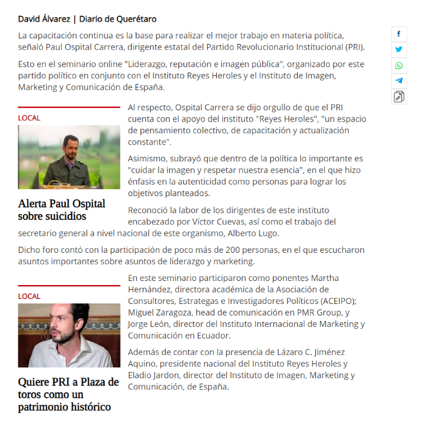 Imparten el seminario «Liderazgo, reputación e imagen pública» 25Jul 20211 Ago 2021 Comparte esto:Tweet Compartir en WhatsApp (Se abre en una ventana nueva) WhatsApp Email a link to a friend (Se abre en una ventana nueva) Correo electrónico Me gusta Cargando... Relacionado