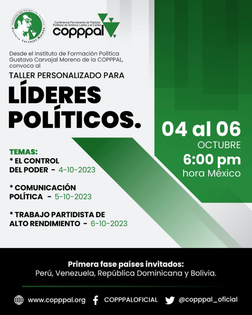 Conferencia «El Control del Poder», en el Taller para Líderes Políticos del Instituto de Formación Política Gustavo Carvajal Moreno, de la Conferencia Permanente de Partidos Políticos de América Latina y el Caribe (Copppal).